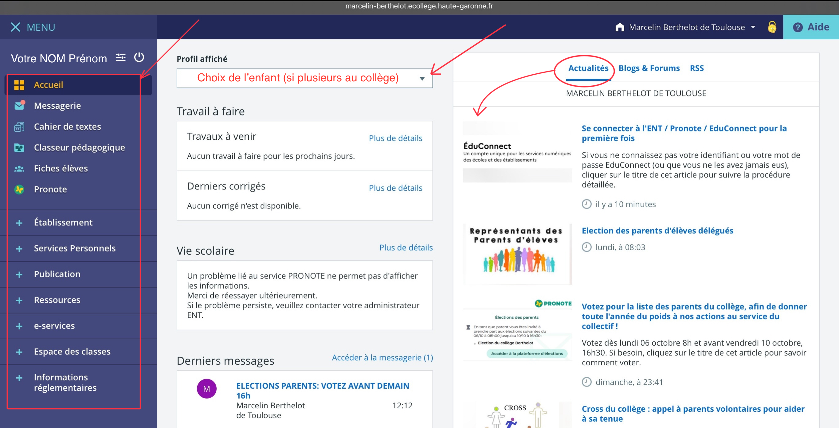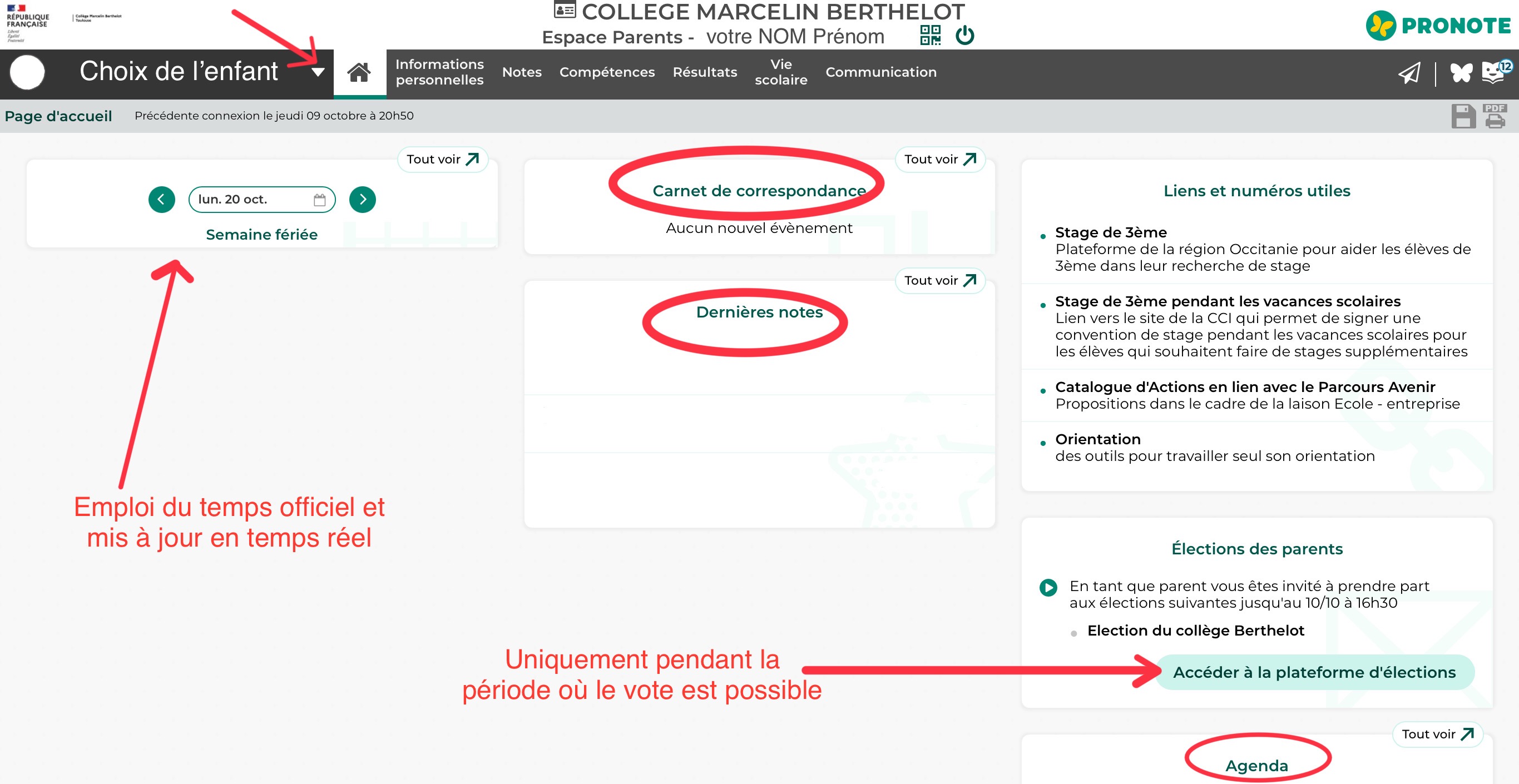 Vous trouverez également les élections des parents d'élèves (sur la période où le vote et possible en ligne), l'agenda qui pourra donner différentes informations (vacances scolaires, sorties, dates des conseils de classe...) et pas mal d'autres choses (dont bulletins, etc.). N'hésitez pas à explorer !