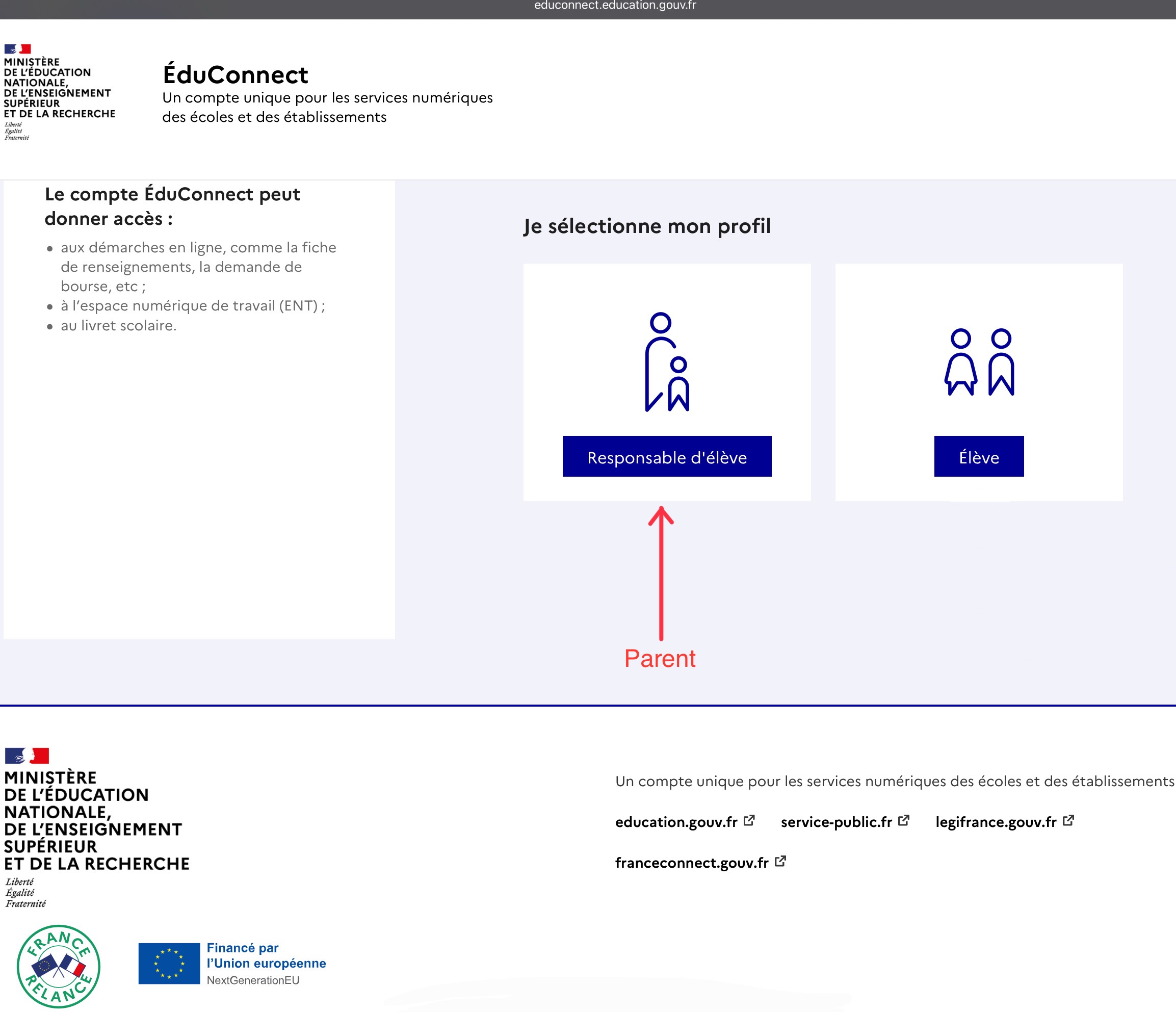Puis choisissez le profil "Responsable d'élève" :