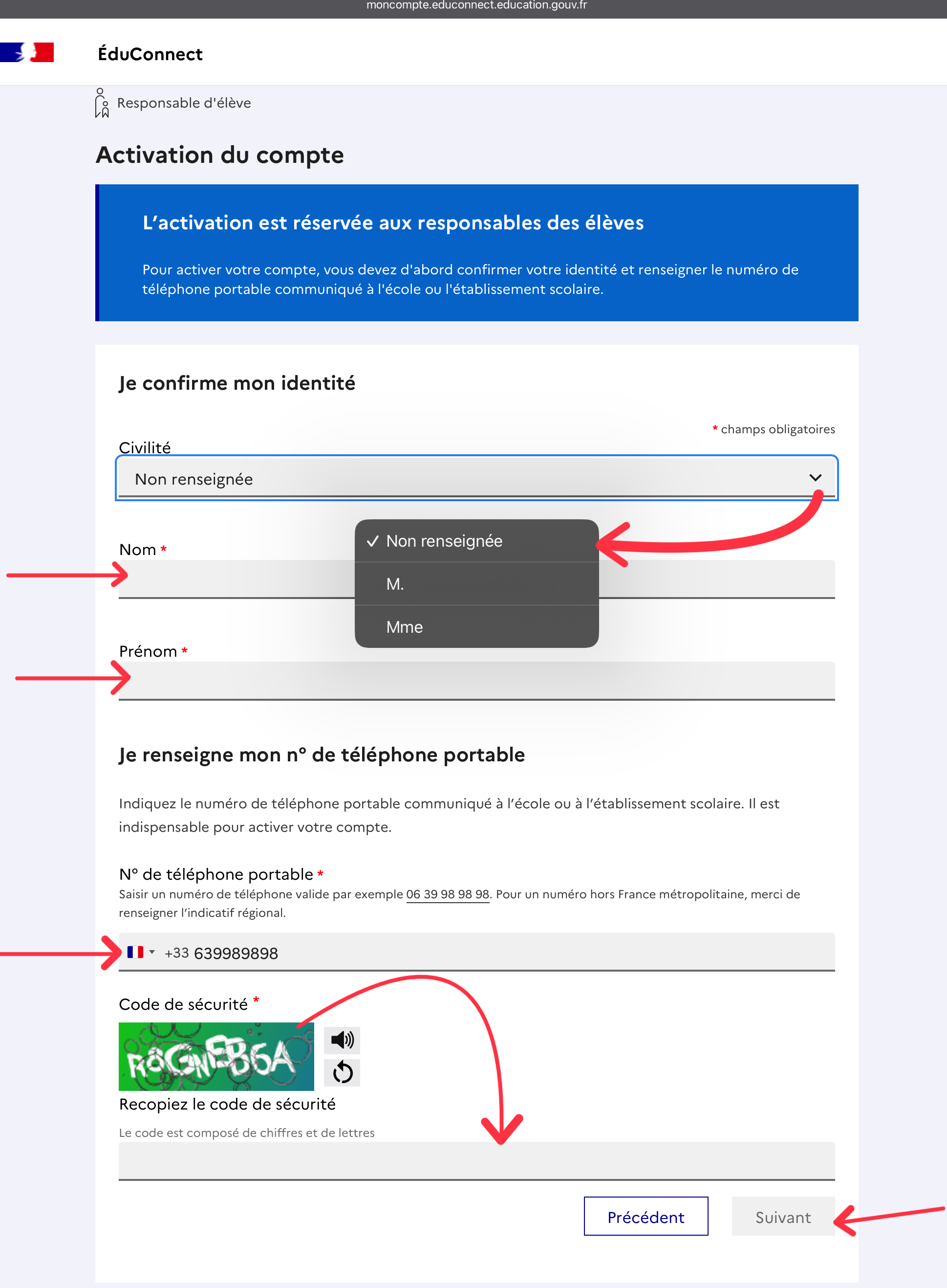 Une fois connecté, EduConnect vous demandera probablement d'associer vos enfants à votre compte (validation de chaque rattachement avec la date de naissance de l'enfant concerné).