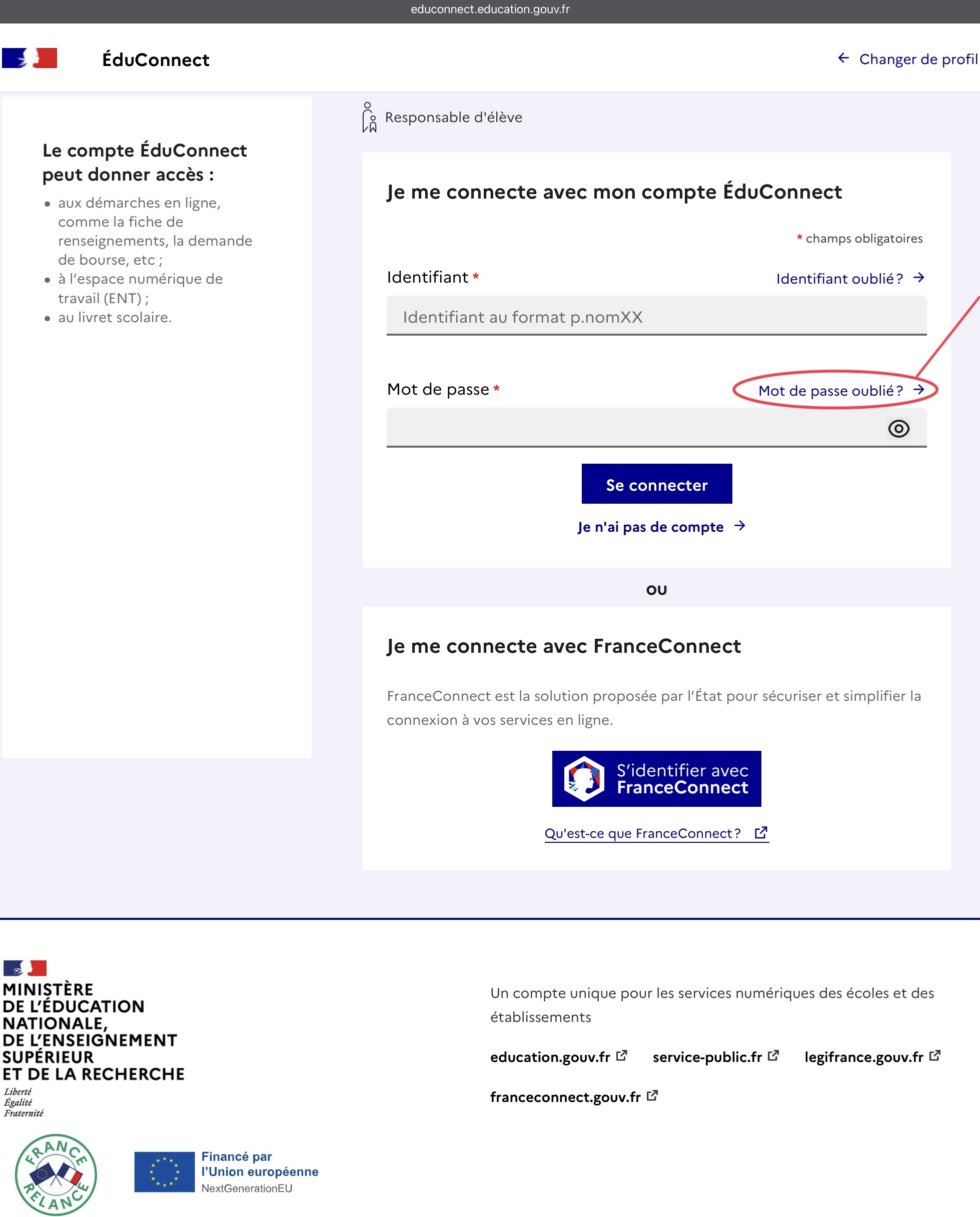 Procédure pour récupérer votre compte EduConnect (si vous ne savez pas si vous en avez un ou si vous avez oublié votre identifiant ou votre mot de passe) :