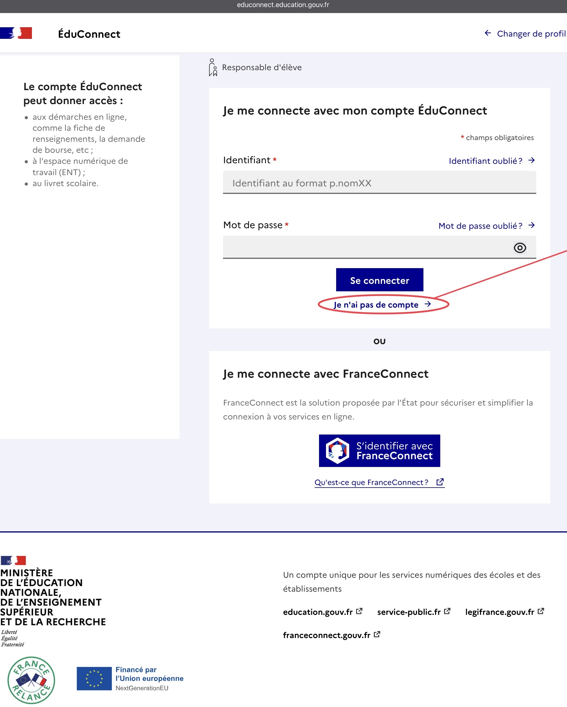 Si vous n'étiez pas arrivé à vous connecter à EduConnect, vous pouvez tenter "je n'ai pas de compte" de façon à vous en créer un :